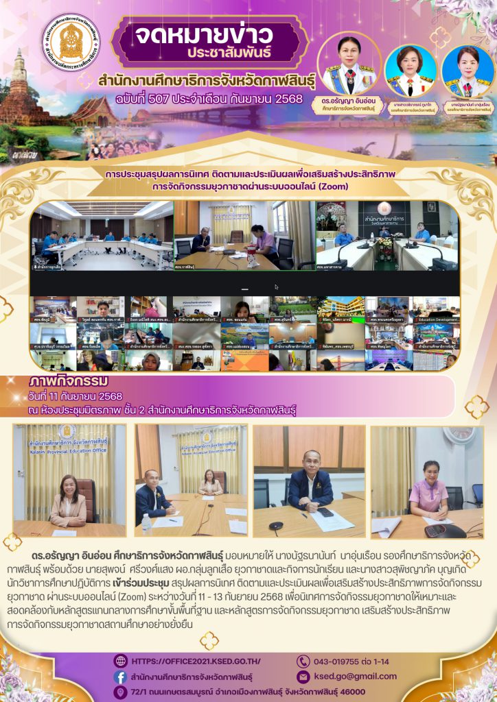 วันที่ 11 กันยายน 2568 เวลา 08.30 น. ณ ห้องประชุมมิตรภาพ ชั้น 2 สำนักงานศึกษาธิการจังหวัดกาฬสินธุ์ ดร.อรัญญา อินอ่อน ศึกษาธิการจังหวัดกาฬสินธุ์ มอบหมายให้ นางนัฐธนานันท์ นาอุ่นเรือน รองศึกษาธิการจังหวัดกาฬสินธุ์ พร้อมด้วย นายสุพจน์ ศรีวงศ์แสง ผอ.กลุ่มลูกเสือ ยุวกาชาดและกิจการนักเรียน และนางสาวสุพิชญาภัค บุญเกิด นักวิชาการศึกษาปฏิบัติการ เข้าร่วมประชุมสรุปผลการนิเทศ ติดตามและประเมินผลเพื่อเสริมสร้างประสิทธิภาพการจัดกิจกรรมยุวกาชาด ผ่านระบบออนไลน์ (Zoom) ระหว่างวันที่ 11 – 13 กันยายน 2568 เพื่อนิเทศการจัดกิจรรมยุวกาชาดให้เหมาะและสอดคล้องกับหลักสูตรแกนกลางการศึกษาขั้นพื้นที่ฐาน และหลักสูตรการจัดกิจกรรมยุวกาชาด เสริมสร้างประสิทธิภาพการจัดกิจกรรมยุวกาชาดสถานศึกษาอย่างยั่งยืน