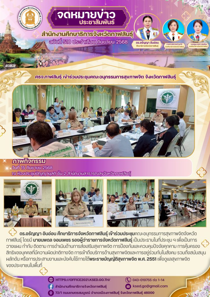 ดร.อรัญญา อินอ่อน ศึกษาธิการจังหวัดกาฬสินธุ์ เข้าร่วมประชุมคณะอนุกรรมการสุขภาพจิตจังหวัดกาฬสินธุ์ โดยมี นายนพดล จอมเพชร รองผู้ว่าราชการจังหวัดกาฬสินธุ์ เป็นประธานในที่ประชุม ฯ เพื่อเป็นการวางแผน กำกับ ติดตาม การดำเนินด้านการส่งเสริมสุขภาพจิต การป้องกันและควบคุมปัจจัยคุกคาม การคุ้มครอง สิทธิของบุคคลที่มีความผิดปกติทางจิต การเข้าถึงบริการด้านสุขภาพจิตและการอยู่ร่วมกันในสังคม รวมถึงสนับสนุน ผลักดัน หรือการประสานงานและบังคับใช้ภายใต้พระราชบัญญัติสุขภาพจิต พ.ศ. 2551 เพื่อดูแลสุขภาพจิต ของประชาชนในพื้นที่