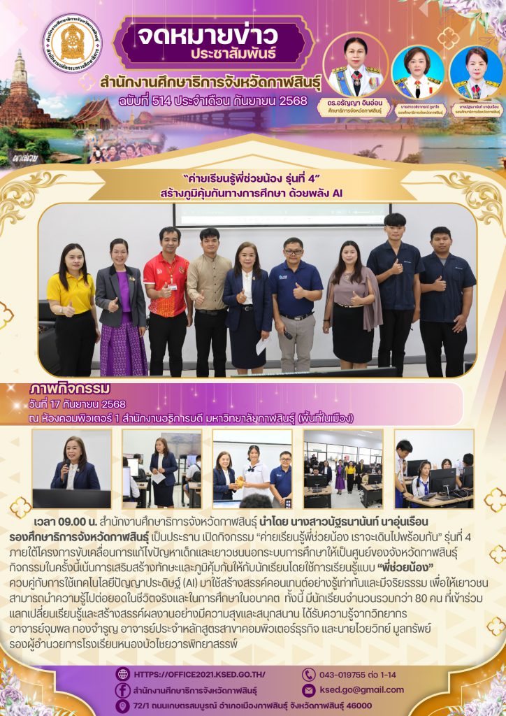 วันที่ 17 กันยายน 2568 เวลา 09.00 น. ณ ห้องคอมพิวเตอร์ 1 สำนักงานอธิการบดี มหาวิทยาลัยกาฬสินธุ์ (พื้นที่ในเมือง) สำนักงานศึกษาธิการจังหวัดกาฬสินธุ์ นำโดย นางสาวนัฐธนานันท์ นาอุ่นเรือนรองศึกษาธิการจังหวัดกาฬสินธุ์ เป็นประธาน เปิดกิจกรรม “ค่ายเรียนรู้พี่ช่วยน้อง เราจะเดินไปพร้อมกัน” รุ่นที่ 4ภายใต้โครงการขับเคลื่อนการแก้ไขปัญหาเด็กและเยาวชนนอกระบบการศึกษาให้เป็นศูนย์ของจังหวัดกาฬสินธุ์กิจกรรมในครั้งนี้เน้นการเสริมสร้างทักษะและภูมิคุ้มกันให้กับนักเรียนโดยใช้การเรียนรู้แบบ “พี่ช่วยน้อง”ควบคู่กับการใช้เทคโนโลยีปัญญาประดิษฐ์ (AI) มาใช้สร้างสรรค์คอนเทนต์อย่างรู้เท่าทันและมีจริยธรรม เพื่อให้เยาวชนสามารถนำความรู้ไปต่อยอดในชีวิตจริงและในการศึกษาในอนาคต ทั้งนี้ มีนักเรียนจำนวนรวมกว่า 80 คน ที่เข้าร่วมแลกเปลี่ยนเรียนรู้และสร้างสรรค์ผลงานอย่างมีความสุขและสนุกสนาน ได้รับความรู้จากวิทยากร