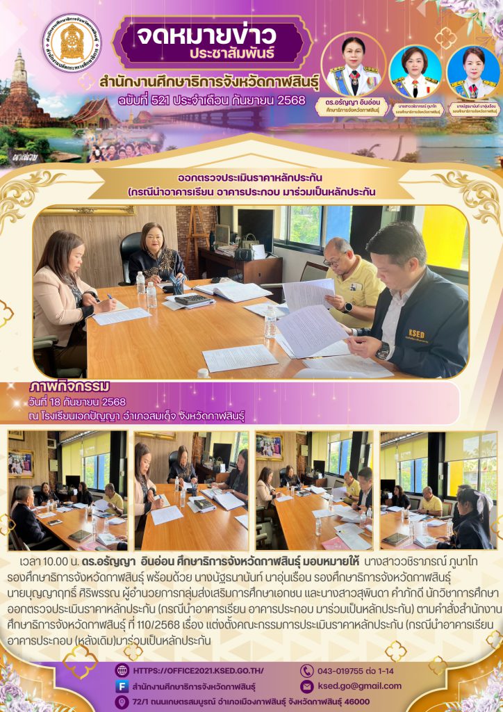 ณ โรงเรียนเอกปัญญา อำเภอสมเด็จ จังหวัดกาฬสินธุ์ ดร.อรัญญา อินอ่อน ศึกษาธิการจังหวัดกาฬสินธุ์ มอบหมายให้ นางสาววชิราภรณ์ ภูนาโท รองศึกษาธิการจังหวัดกาฬสินธุ์ พร้อมด้วย นางนัฐธนานันท์ นาอุ่นเรือน รองศึกษาธิการจังหวัดกาฬสินธุ์ นายบุญญาฤทธิ์ ศิริพรรณ ผู้อำนวย การกลุ่มส่งเสริมการศึกษาเอกชน และนางสาวสุพินดา คำภักดี นักวิชาการศึกษา ออกตรวจประเมินราคาหลักประกัน (กรณีนำอาคารเรียน อาคารประกอบ มาร่วมเป็นหลักประกัน) ตามคำสั่งสำนักงานศึกษาธิการจังหวัดกาฬสินธุ์ ที่ 110/2568 เรื่อง แต่งตั้งคณะกรรมการประเมินราคาหลักประกัน (กรณีนำอาคารเรียน อาคารประกอบ (หลังเดิม) มาร่วมเป็นหลักประกัน
