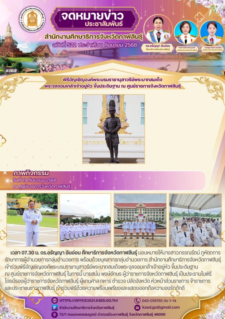 วันที่ 19 กันยายน 2568เวลา 07.30 น. ดร.อรัญญา อินอ่อน ศึกษาธิการจังหวัดกาฬสินธุ์ มอบหมายให้นางสาวภรรณรัตน์ ภูหัตถการ รักษาการผู้อำนวยการกลุ่มอำนวยการ พร้อมด้วยบุคลากรกลุ่มอำนวยการ สำนักงานศึกษาธิการจังหวัดกาฬสินธุ์ เข้าร่วมพิธีอัญเชิญองค์พระบรมราชานุสาวรีย์พระบาทสมเด็จพระจุลจอมเกล้าเจ้าอยู่หัว ขึ้นประดิษฐาน ณ ศูนย์ราชการจังหวัดกาฬสินธุ์ ในการนี้ นายสนั่น พงษ์อักษร ผู้ว่าราชการจังหวัดกาฬสินธุ์ เป็นประธานในพิธี โดยมีรองผู้ว่าราชการจังหวัดกาฬสินธุ์ ผู้แทนศาล ทหาร ตำรวจ ปลัดจังหวัด หัวหน้าส่วนราชการ ข้าราชการ และประชาชนชาวกาฬสินธุ์ เข้าร่วมพิธีด้วยความพร้อมเพรียงและแสดงออกถึงความจงรักภักดี