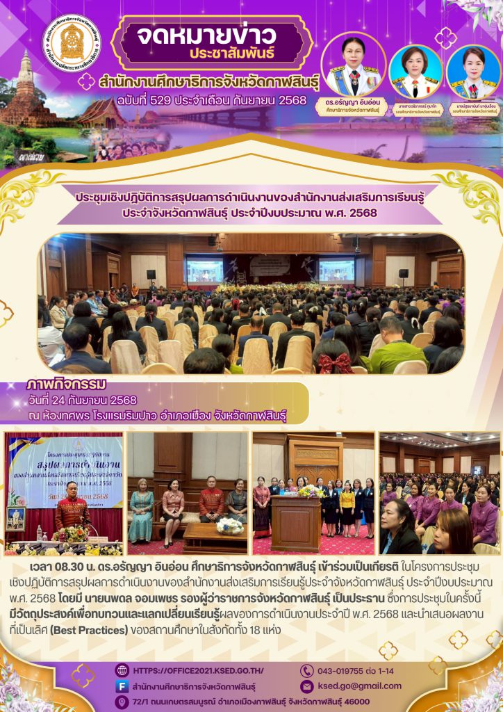 ดร.อรัญญา อินอ่อน ศึกษาธิการจังหวัดกาฬสินธุ์ เข้าร่วมเป็นเกียรติ ในโครงการประชุมเชิงปฏิบัติการสรุปผลการดำเนินงานของสำนักงานส่งเสริมการเรียนรู้ประจำจังหวัดกาฬสินธุ์ ประจำปีงบประมาณ พ.ศ. 2568 โดยมี นายนพดล จอมเพชร รองผู้ว่าราชการจังหวัดกาฬสินธุ์ เป็นประธาน ซึ่งการประชุมในครั้งนี้ มีวัตถุประสงค์เพื่อทบทวนและแลกเปลี่ยนเรียนรู้ผลของการดำเนินงานประจำปี พ.ศ. 2568 และนำเสนอผลงาน ที่เป็นเลิศ (Best Practices) ของสถานศึกษาในสังกัดทั้ง 18 แห่ง