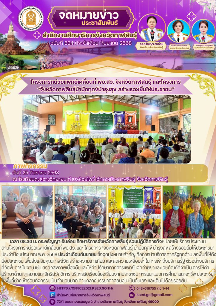 โครงการหน่วยแพทย์เคลื่อนที่ พอ.สว. และ โครงการ “จังหวัดกาฬสินธุ์ บำบัดทุกข์ บำรุงสุข สร้างรอยยิ้มให้ประชาชน” ประจำปีงบประมาณ พ.ศ. 2568 ประจำเดือนกันยายน