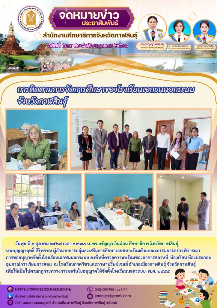 วันนพุธ ที่ ๑ ตุลาคม ๒๕๖๘ เวลา ๐๙.๓๐ น. ดร.อรัญญา อินอ่อน ศึกษาธิการจังหวัดกาฬสินธุ์ นายบุญญาฤทธิ์ ศิริพรรณ ผู้อำนวยการกลุ่มส่งเสริมการศึกษาเอกชน พร้อมด้วยคณะกรรมการตรวจพิจารณา การขออนุญาตจัดตั้งโรงเรียนเอกชนนอกระบบ ลงพื้นพื้นที่ตรวจความพร้อมของอาคารสถานที่ ห้องเรียน ห้องประกอบ อุปกรณ์การเรียนการสอน ณ โรงเรียนกวดวิชาและภาษาปริ้นซ์เจมส์ อำเภอเมืองกาฬสินธุ์ จังหวัดกาฬสินธ์เพื่อให้เป็นไปตามกฎกระทรวงการขอรับใบอนุญาตให้จัดตั้งโรงเรียนนอกระบบ พ.ศ. ๒๕๕๕