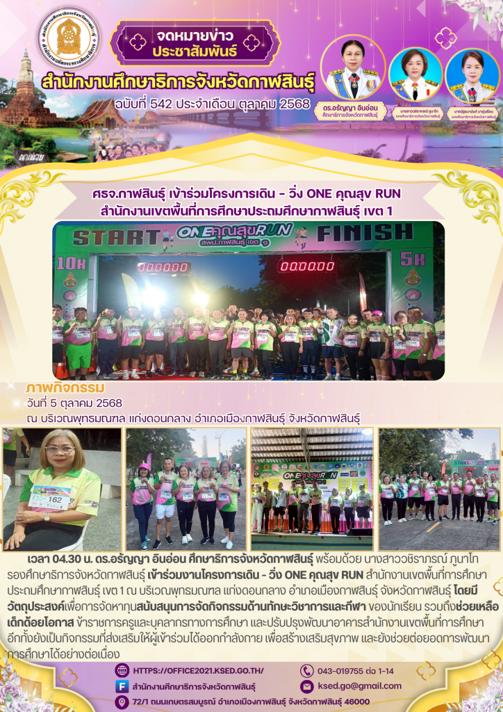 วันที่ 5 ตุลาคม 2568 เวลา 04.30 น. ดร.อรัญญา อินอ่อน ศึกษาธิการจังหวัดกาฬสินธุ์ พร้อมด้วย นางสาววชิราภรณ์ ภูนาโท รองศึกษาธิการจังหวัดกาฬสินธุ์ เข้าร่วมงานโครงการเดิน – วิ่ง ONE คุณสุข RUN สำนักงานเขตพื้นที่การศึกษา