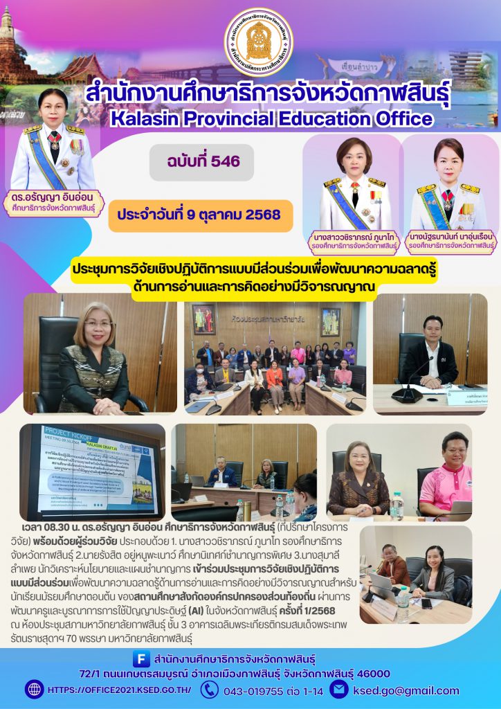 วันที่ 9 ตุลาคม 2568 เวลา 08.30 น. ดร.อรัญญา อินอ่อน ศึกษาธิการจังหวัดกาฬสินธุ์ (ที่ปรึกษาโครงการวิจัย) พร้อมด้วยผู้ร่วมวิจัย ประกอบด้วย 1. นางสาววชิราภรณ์ ภูนาโท รองศึกษาธิการจังหวัดกาฬสินธุ์ 2.นายรังสิต อยู่หนูพะเนาว์ ศึกษานิเทศก์ชำนาญการพิเศษ 3.นางสุมาลีลำเพย นักวิเคราะห์นโยบายและแผนชำนาญการ เข้าร่วมประชุมการวิจัยเชิงปฏิบัติการ