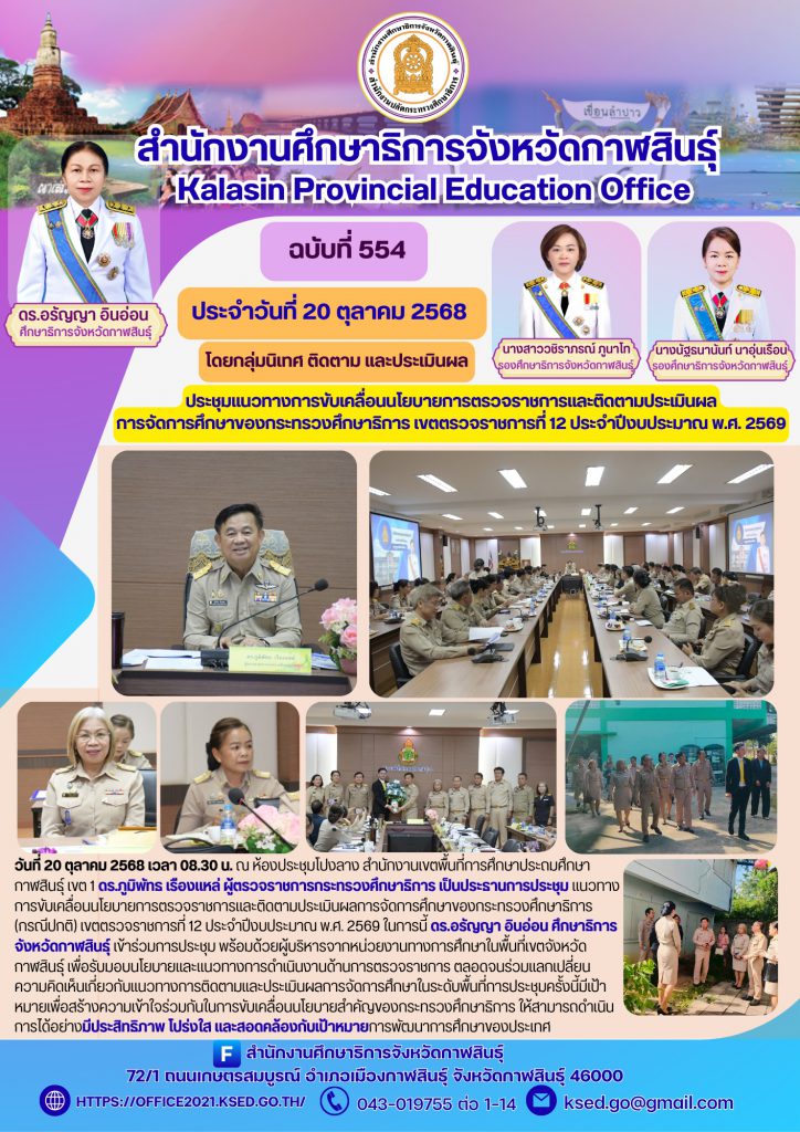 วันที่ 20 ตุลาคม 2568 เวลา 08.30 น. ณ ห้องประชุมโปงลาง สำนักงานเขตพื้นที่การศึกษาประถมศึกษากาฬสินธุ์ เขต 1 ดร.ภูมิพัทธ เรืองแหล่ ผู้ตรวจราชการกระทรวงศึกษาธิการ เป็นประธานการประชุม แนวทางการขับเคลื่อนนโยบายการตรวจราชการและติดตามประเมินผลการจัดการศึกษาของกระทรวงศึกษาธิการ (กรณีปกติ) เขตตรวจราชการที่ 12 ประจำปีงบประมาณ พ.ศ. 2569 ในการนี้ ดร.อรัญญา อินอ่อน ศึกษาธิการจังหวัดกาฬสินธุ์ เข้าร่วมการประชุม พร้อมด้วยผู้บริหารจากหน่วยงานทางการศึกษาในพื้นที่เขตจังหวัดกาฬสินธุ์ เพื่อรับมอบนโยบายและแนวทางการดำเนินงานด้านการตรวจราชการ ตลอดจนร่วมแลกเปลี่ยนความคิดเห็นเกี่ยวกับแนวทางการติดตามและประเมินผลการจัดการศึกษาในระดับพื้นที่การประชุมครั้งนี้มีเป้าหมายเพื่อสร้างความเข้าใจร่วมกันในการขับเคลื่อนนโยบายสำคัญของกระทรวงศึกษาธิการ ให้สามารถดำเนินการได้อย่างมีประสิทธิภาพ โปร่งใส และสอดคล้องกับเป้าหมายการพัฒนาการศึกษาของประเทศhttps://drive.google.com/drive/folders/1LOUlvCr-phWrJ2FvWfvr9LoTVv7RyeHf