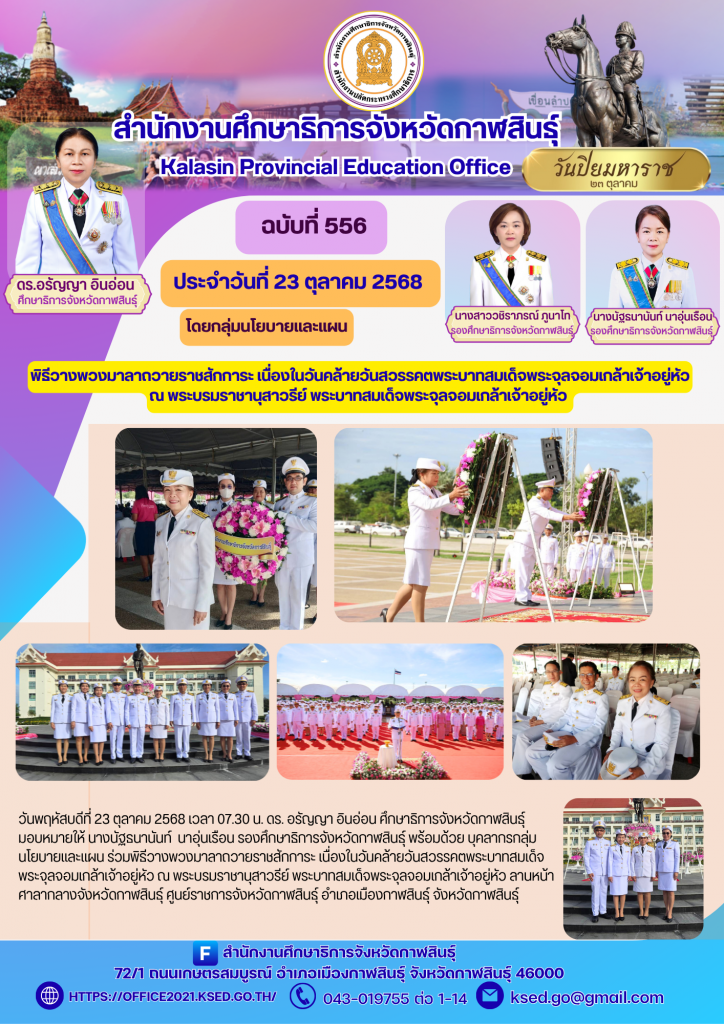 วันพฤหัสบดีที่ 23 ตุลาคม 2568 เวลา 07.30 น. ดร. อรัญญา อินอ่อน ศึกษาธิการจังหวัดกาฬสินธุ์ มอบหมายให้ นางนัฐธนานันท์ นาอุ่นเรือน รองศึกษาธิการจังหวัดกาฬสินธุ์ พร้อมด้วย บุคลากรกลุ่มนโยบายและแผน ร่วมพิธีวางพวงมาลาถวายราชสักการะ เนื่องในวันคล้ายวันสวรรคตพระบาทสมเด็จพระจุลจอมเกล้าเจ้าอยู่หัว ณ พระบรมราชานุสาวรีย์ พระบาทสมเด็จพระจุลจอมเกล้าเจ้าอยู่หัว ลานหน้าศาลากลางจังหวัดกาฬสินธุ์ ศูนย์ราชการจังหวัดกาฬสินธุ์ อำเภอเมืองกาฬสินธุ์ จังหวัดกาฬสินธุ์