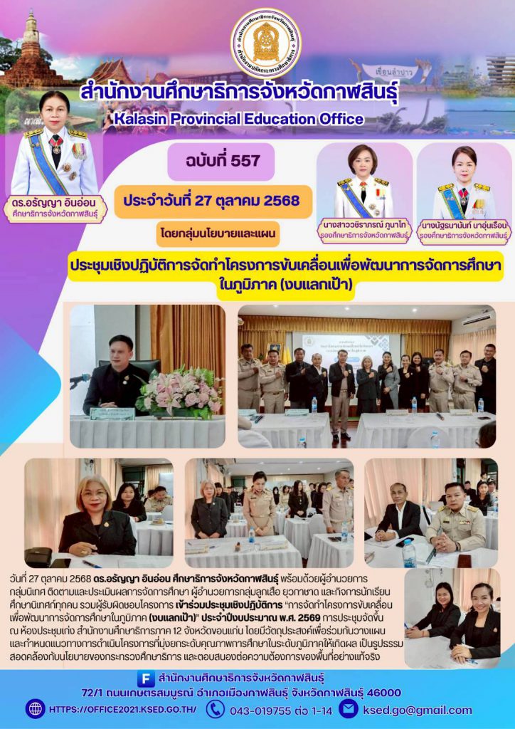 วันที่ 27 ตุลาคม 2568 ดร.อรัญญา อินอ่อน ศึกษาธิการจังหวัดกาฬสินธุ์ พร้อมด้วยผู้อำนวยการกลุ่มนิเทศ ติดตามและประเมินผลการจัดการศึกษา ผู้อำนวยการกลุ่มลูกเสือ ยุวกาชาด และกิจการนักเรียน ศึกษานิเทศก์ทุกคน รวมผู้รับผิดชอบโครงการ เข้าร่วมประชุมเชิงปฏิบัติการ “การจัดทำโครงการขับเคลื่อนเพื่อพัฒนาการจัดการศึกษาในภูมิภาค (งบแลกเป้า)” ประจำปีงบประมาณ พ.ศ. 2569 การประชุมจัดขึ้น ณ ห้องประชุมเก่ง สำนักงานศึกษาธิการภาค 12 จังหวัดขอนแก่น โดยมีวัตถุประสงค์เพื่อร่วมกันวางแผนและกำหนดแนวทางการดำเนินโครงการที่มุ่งยกระดับคุณภาพการศึกษาในระดับภูมิภาคให้เกิดผลเป็นรูปธรรม สอดคล้องกับนโยบายของกระทรวงศึกษาธิการ และตอบสนองต่อความต้องการของพื้นที่อย่างแท้จริง.