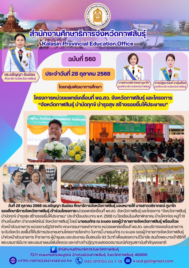 รองศึกษาธิการจังหวัดกาฬสินธุ์ เข้าร่วมโครงการหน่วยแพทย์เคลื่อนที่ พอ.สว. จังหวัดกาฬสินธุ์ และโครงการ “จังหวัดกาฬสินธุ์ บำบัดทุกข์ บำรุงสุข สร้างรอยยิ้มให้ประชาชน” ประจำปีงบประมาณ พ.ศ. 2568 ณ โรงเรียนโนนศิลาพิทยาคม บ้านโคกก่อง หมู่ที่ 10 ตำบลโนนศิลา อำเภอสหัสขันธ์ จังหวัดกาฬสินธุ์ โดยมี นายธนภัทร ณ ระนอง รองผู้ว่าราชการจังหวัดกาฬสินธุ์ พร้อมด้วยหัวหน้าส่วนราชการ หน่วยงานรัฐวิสาหกิจ คณะกรรมการเหล่ากาชาด หน่วยแพทย์เคลื่อนที่ พอ.สว. และบริการของส่วนราชการระดับจังหวัด ลงพื้นที่ให้บริการประชาชนตามโครงการดังกล่าว ในการนี้ นายธนภัทร ณ ระนอง รองผู้ว่าราชการจังหวัดกาฬสินธุ์นำหัวหน้าส่วนราชการ ข้าราชการ ผู้นำชุมชน และประชาชน ยืนสงบนิ่ง 93 วินาที เพื่อแสดงความไว้อาลัย สมเด็จพระนางเจ้าสิริกิติ์พระบรมราชินีนาถ พระบรมราชชนนีพันปีหลวง และกล่าวคำปฏิญาณแสดงเจตนารมณ์เทิดทูนสถาบันสำคัญของชาติ