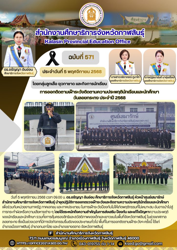 สำนักงานศึกษาธิการจังหวัดกาฬสินธุ์ นำชุดปฏิบัติการออกตรวจเฝ้าระวังและติดตามความประพฤตินักเรียนและนักศึกษา
