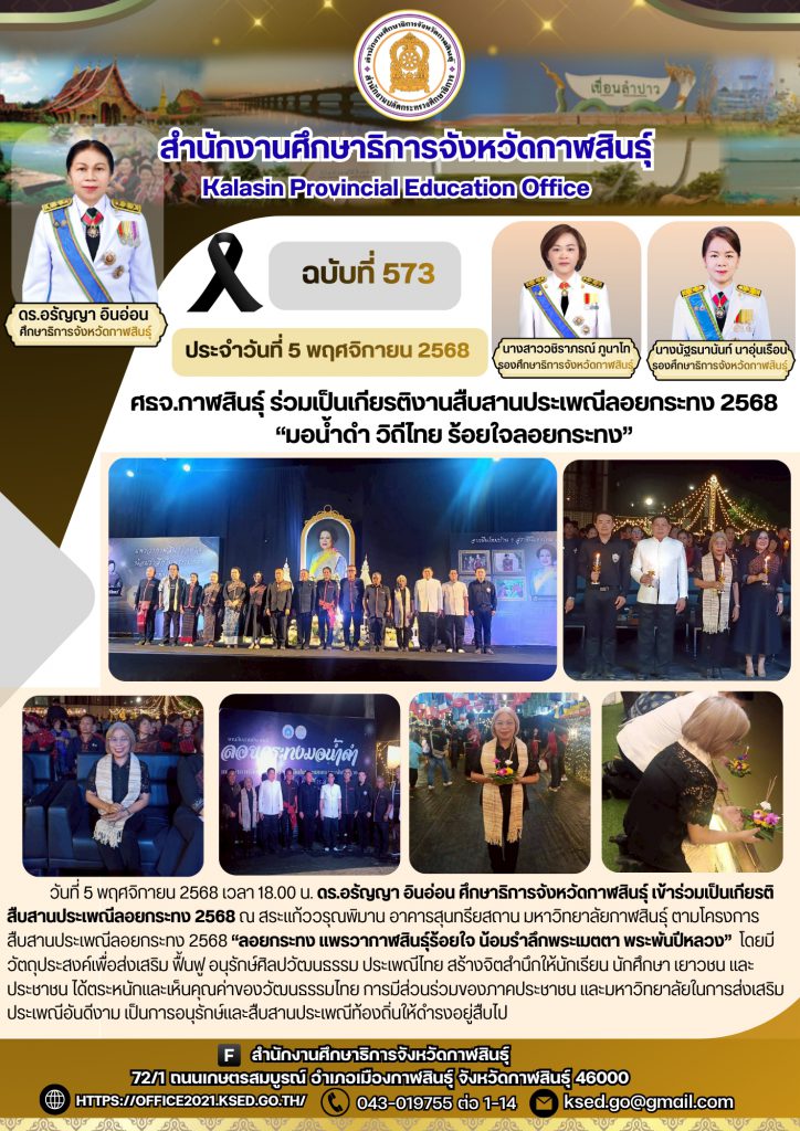 วันที่ 5 พฤศจิกายน 2568 เวลา 18.00 น. ดร.อรัญญา อินอ่อน ศึกษาธิการจังหวัดกาฬสินธุ์ เข้าร่วมเป็นเกียรติสืบสานประเพณีลอยกระทง 2568 ณ สระแก้ววรุณพิมาน อาคารสุนทรียสถาน มหาวิทยาลัยกาฬสินธุ์ ตามโครงการสืบสานประเพณีลอยกระทง 2568 “ลอยกระทง แพรวากาฬสินธุ์ร้อยใจ น้อมรำลึกพระเมตตา พระพันปีหลวง” โดยมีวัตถุประสงค์เพื่อส่งเสริม ฟื้นฟู อนุรักษ์ศิลปวัฒนธรรม ประเพณีไทย สร้างจิตสำนึกให้นักเรียน นักศึกษา เยาวชน และ