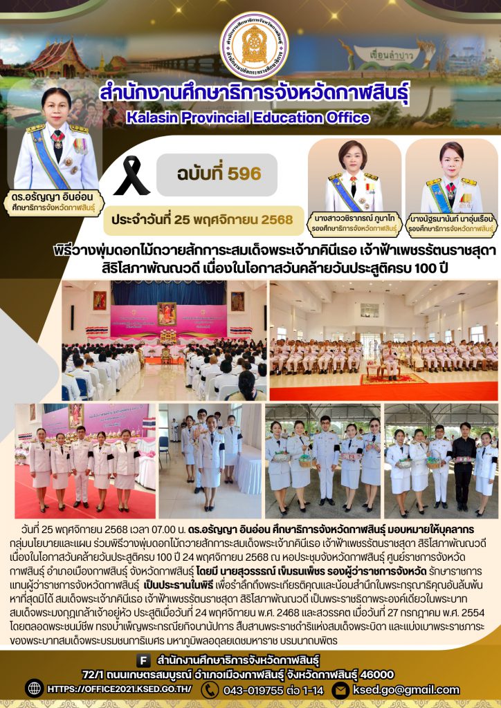 วันที่ 25 พฤศจิกายน 2568 เวลา 07.00 น. ดร.อรัญญา อินอ่อน ศึกษาธิการจังหวัดกาฬสินธุ์ มอบหมายให้บุคลากรกลุ่มนโยบายและแผน ร่วมพิธีวางพุ่มดอกไม้ถวายสักการะสมเด็จพระเจ้าภคินีเธอ เจ้าฟ้าเพชรรัตนราชสุดา สิริโสภาพัณณวดี เนื่องในโอกาสวันคล้ายวันประสูติครบ 100 ปี 24 พฤศจิกายน 2568 ณ หอประชุมจังหวัดกาฬสินธุ์ ศูนย์ราชการจังหวัดกาฬสินธุ์ อำเภอเมืองกาฬสินธุ์ จังหวัดกาฬสินธุ์ โดยมี นายสุวรรธณ์ เข็มธนเพ็ชร รองผู้ว่าราชการจังหวัด รักษาราชการแทนผู้ว่าราชการจังหวัดกาฬสินธุ์ เป็นประธานในพิธี เพื่อรำลึกถึงพระเกียรติคุณและน้อมสำนึกในพระกรุณาธิคุณอันล้นพ้นหาที่สุดมิได้ สมเด็จพระเจ้าภคินีเธอ เจ้าฟ้าเพชรรัตนราชสุดา สิริโสภาพัณณวดี เป็นพระราชธิดาพระองค์เดียวในพระบาทสมเด็จพระมงกุฎเกล้าเจ้าอยู่หัว ประสูติเมื่อวันที่ 24 พฤศจิกายน พ.ศ. 2468 และสวรรคต เมื่อวันที่ 27 กรกฎาคม พ.ศ. 2554 โดยตลอดพระชนม์ชีพ ทรงบำเพ็ญพระกรณียกิจนานัปการ สืบสานพระราชดำริแห่งสมเด็จพระบิดา และแบ่งเบาพระราชภาระของพระบาทสมเด็จพระบรมชนกาธิเบศร มหาภูมิพลอดุลยเดชมหาราช บรมนาถบพิตร