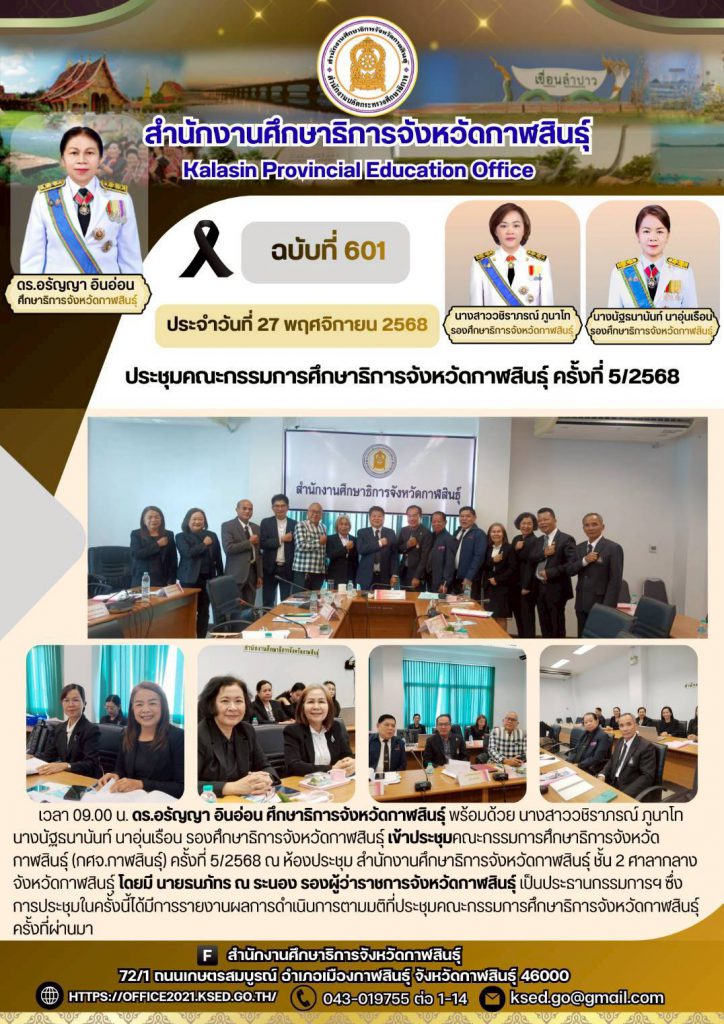 นางนัฐธนานันท์ นาอุ่นเรือน รองศึกษาธิการจังหวัดกาฬสินธุ์ เข้าประชุมคณะกรรมการศึกษาธิการจังหวัดกาฬสินธุ์ (กศจ.กาฬสินธุ์) ครั้งที่ 5/2568 ณ ห้องประชุม สำนักงานศึกษาธิการจังหวัดกาฬสินธุ์ ชั้น 2 ศาลากลางจังหวัดกาฬสินธุ์ โดยมี นายธนภัทร ณ ระนอง รองผู้ว่าราชการจังหวัดกาฬสินธุ์ เป็นประธานกรรมการฯ ซึ่งการประชุมในครั้งนี้ได้มีการรายงานผลการดำเนินการตามมติที่ประชุมคณะกรรมการศึกษาธิการจังหวัดกาฬสินธุ์ ครั้งที่ผ่านมา