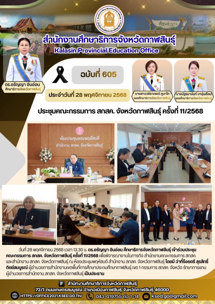 วันที่ 28 พฤศจิกายน 2568 เวลา 13.30 น. ดร.อรัญญา อินอ่อน ศึกษาธิการจังหวัดกาฬสินธุ์ เข้าร่วมประชุมคณะกรรมการ สกสค.จังหวัดกาฬสินธุ์ ครั้งที่ 11/2568 เพื่อพิจารณางานในภารกิจ สำนักงานคณะกรรมการ สกสค. และสำนักงาน สกสค. จังหวัดกาฬสินธุ์ ณ ห้องประชุมพฤหัสบดี สำนักงาน สกสค. จังหวัดกาฬสินธุ์ โดยมี ว่าที่ร้อยตรี สุรสิทธิ์ ถิตย์สมบูรณ์ ผู้อำนวยการสำนักงานเขตพื้นที่การศึกษาประถมศึกษากาฬสินธุ์ เขต 1 กรรมการ สกสค. จังหวัด รักษาการแทนผู้อำนวยการสำนักงาน สกสค. จังหวัดกาฬสินธุ์ เป็นประธาน