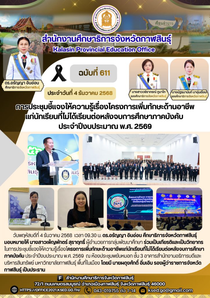 วันพฤหัสบดีที่ 4 ธันวาคม 2568 เวลา 09.30 น. ดร.อรัญญา อินอ่อน ศึกษาธิการจังหวัดกาฬสินธุ์ มอบหมายให้ นางสาวเพ็ญพักตร์ สุราฤทธิ์ ผู้อำนวยการกลุ่มพัฒนาศึกษา ร่วมเป็นเกียรติและเป็นวิทยากรในการประชุมชี้แจงให้ความรู้เรื่องโครงการเพิ่มทักษะด้านอาชีพแก่นักเรียนที่ไม่ได้เรียนต่อหลังจบการศึกษาภาคบังคับ ประจำปีงบประมาณ พ.ศ. 2569 ณ ห้องประชุมพยับหมอก ชั้น 3 อาคารสำนักงานอธิการบดีและบริหารสินทรัพย์ มหาวิทยาลัยกาฬสินธุ์ พื้นที่ในเมืองโดยมี นายผดุงศักดิ์ อิ่มเอิบ รองผู้ว่าราชการจังหวัดกาฬสินธุ์เป็นประธาน