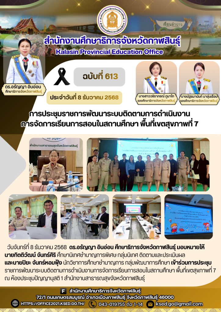 วันจันทร์ที่ 8 ธันวาคม 2568 ดร.อรัญญา อินอ่อน ศึกษาธิการจังหวัดกาฬสินธุ์ มอบหมายให้นายกิตติวัฒน์ จันทร์ศิริ ศึกษานิเทศชำนาญการพิเศษ กลุ่มนิเทศ ติดตามและประเมินผล และนายปิยะ จันทร์หอมฟุ้ง นักวิชาการศึกษาชำนาญการ กลุ่มพัฒนาการศึกษา เข้าร่วมการประชุมราชการพัฒนาระบบติดตามการดำเนินงานการจัดการเรียนการสอนในสถานศึกษา พื้นที่เขตสุขภาพที่ 7 ณ ห้องประชุมปัญญานุสติ 1 สำนักงานสาธารณสุขจังหวัดกาฬสินธุ์