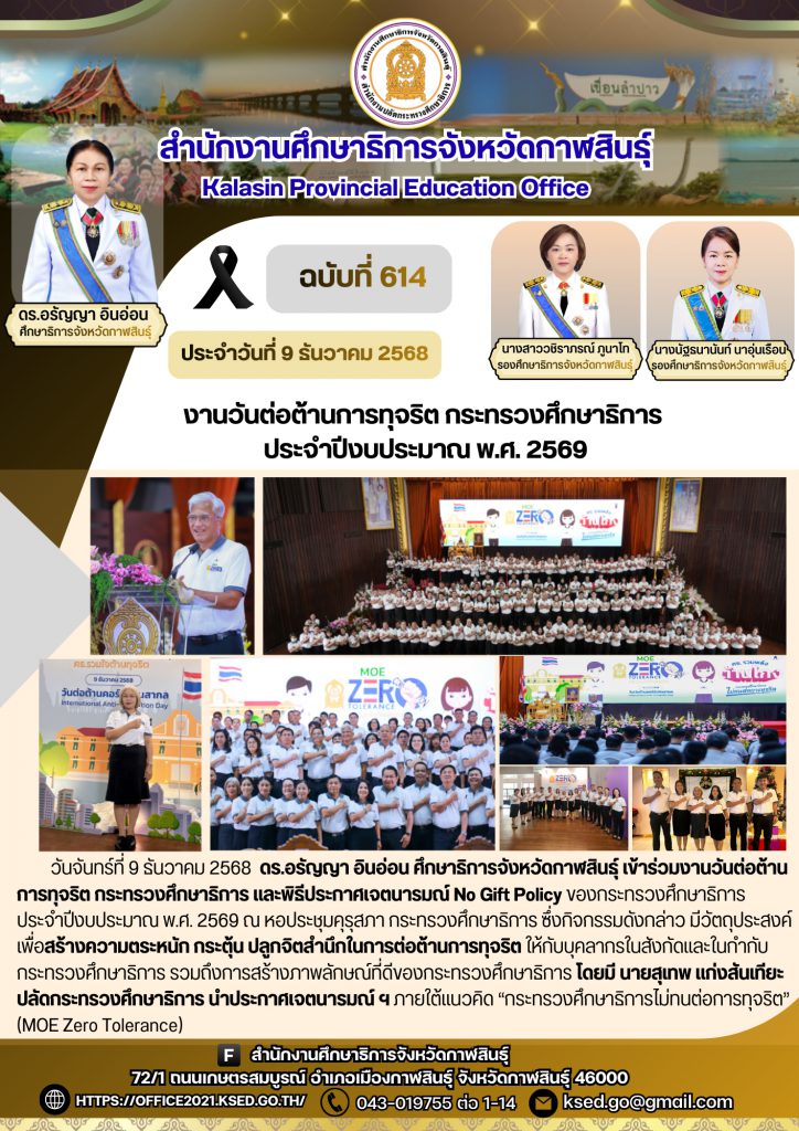 วันจันทร์ที่ 9 ธันวาคม 2568 ดร.อรัญญา อินอ่อน ศึกษาธิการจังหวัดกาฬสินธุ์ เข้าร่วมงานวันต่อต้านการทุจริต กระทรวงศึกษาธิการ และพิธีประกาศเจตนารมณ์ No Gift Policy ของกระทรวงศึกษาธิการ ประจำปีงบประมาณ พ.ศ. 2569 ณ หอประชุมคุรุสภา กระทรวงศึกษาธิการ ซึ่งกิจกรรมดังกล่าว มีวัตถุประสงค์เพื่อสร้างความตระหนัก กระตุ้น ปลูกจิตสำนึกในการต่อต้านการทุจริต ให้กับบุคลากรในสังกัดและในกำกับกระทรวงศึกษาธิการ รวมถึงการสร้างภาพลักษณ์ที่ดีของกระทรวงศึกษาธิการ โดยมี นายสุเทพ แก่งสันเทียะ ปลัดกระทรวงศึกษาธิการ นำประกาศเจตนารมณ์ ฯ ภายใต้แนวคิด “กระทรวงศึกษาธิการไม่ทนต่อการทุจริต”
