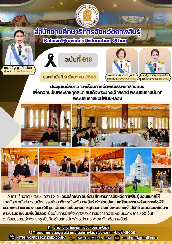 วันที่ 9 ธันวาคม 2568 เวลา 08.45 ดร.อรัญญา อินอ่อน ศึกษาธิการจังหวัดกาฬสินธุ์ มอบหมายให้