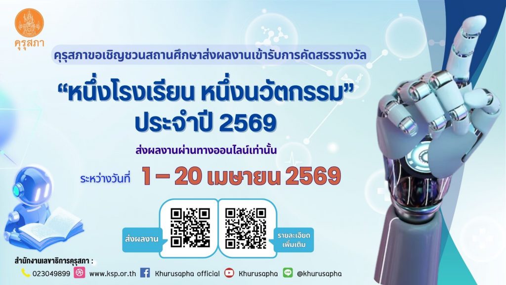 คุรุสภาประกาศคัดเลือก รางวัลหนึ่งโรงเรียน หนึ่งนวัตกรรม ประจำปี 2569 19 มีนาคม 256919 มีนาคม 2026 รุ่งอรุณ เลื่อมเรือง ข่าวประชาสัมพันธ์ ดูรายละเอียดได้ที่ https://www.ksp.or.th/2026/03/17/61251/ รุ่งอรุณ เลื่อมเรือง