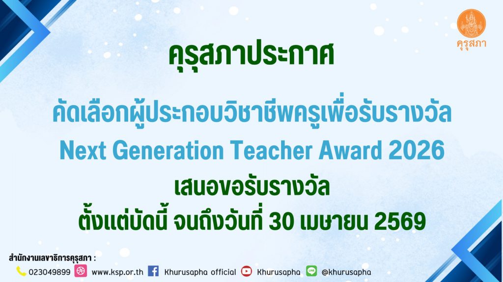 คุรุสภาประกาศคัดเลือก รางวัล Next Generation Teacher Award 2026 19 มีนาคม 256919 มีนาคม 2026 รุ่งอรุณ เลื่อมเรือง ข่าวประชาสัมพันธ์ ดูรายละเอียดได้ที่ : https://www.ksp.or.th/2026/03/16/61224/ รุ่งอรุณ เลื่อมเรือง