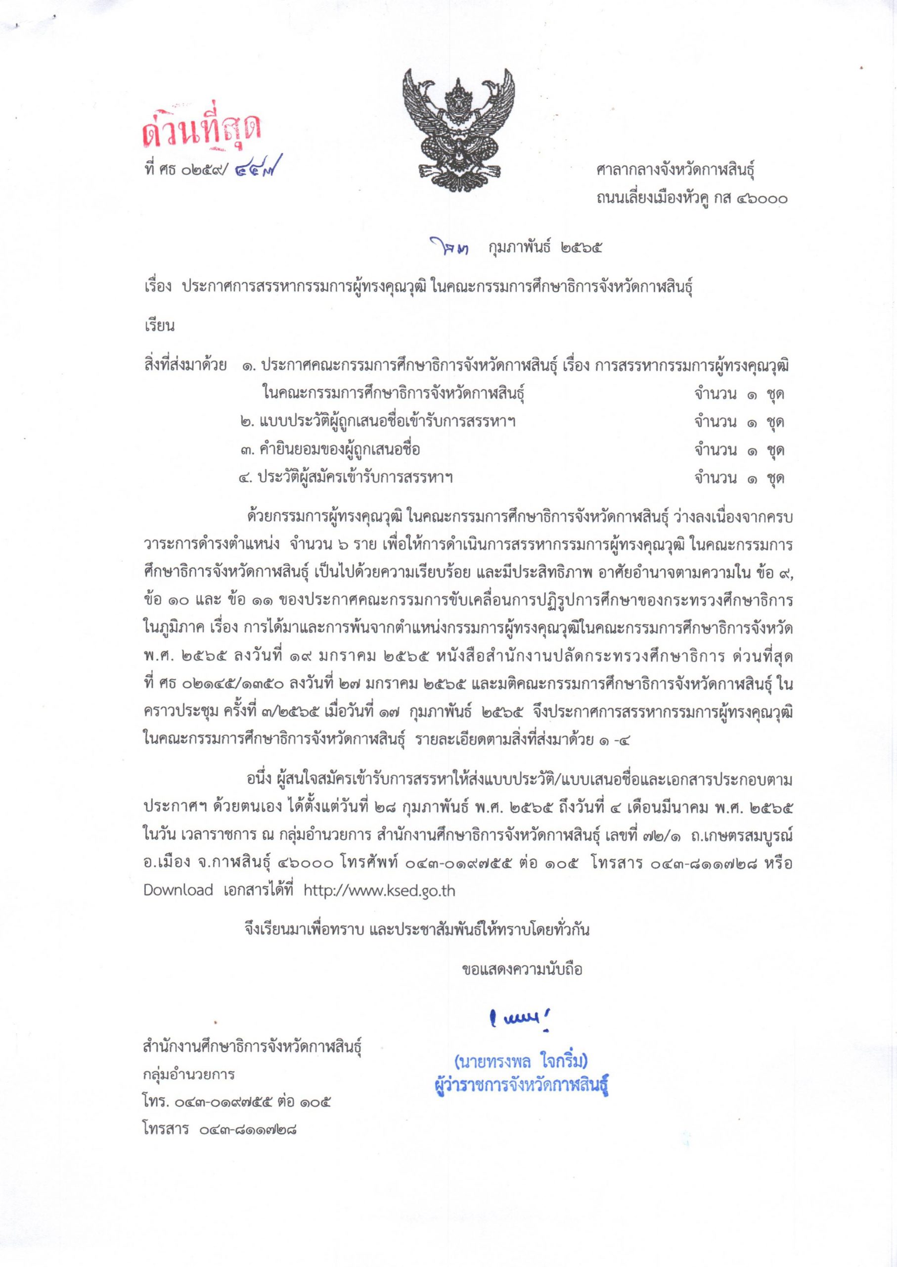 ประกาศ เรื่อง การสรรหาผู้ทรงคุณวุฒิ ในคณะอนุกรรมการศึกษาธิการจังหวัดกาฬสินธุ์โดย : นายน่านนที คำมี1 สิงหาคม 2565